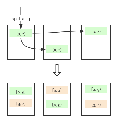 前面提到 ByteKV 采用 Range 分区的方式提供扩展性,这种分区方式带来的一个问题是:随着业务发展,原有的分区结构不再适用于新的业务模式。比如业务写入热点变化,热点从一个分区漂移到另一个分区。为了解决这个问题,ByteKV 实现了自动分裂的功能:通过对用户写入进行采样,当数据量超过一定阈值后,从中间将 Range 切分为两个新的 Range。分裂功能配合上调度,提供了自动扩展的能力。