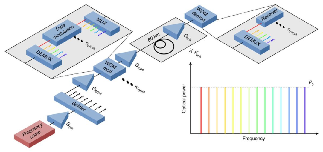 该光源由定制设计的光学芯片发出,它可以使用来自单个红外激光器的光来输出多种颜色的彩虹光谱,即多种频率。因此,单个激光器的一个频率(颜色)可以在单个芯片中倍增成数百个频率(颜色)。所有的颜色都固定在一个特定的频率距离上,每种颜色互相隔离——就像梳子上的齿一样——因此它被称为频率梳。最后,所有频率通过光纤发送,从而传输数据。