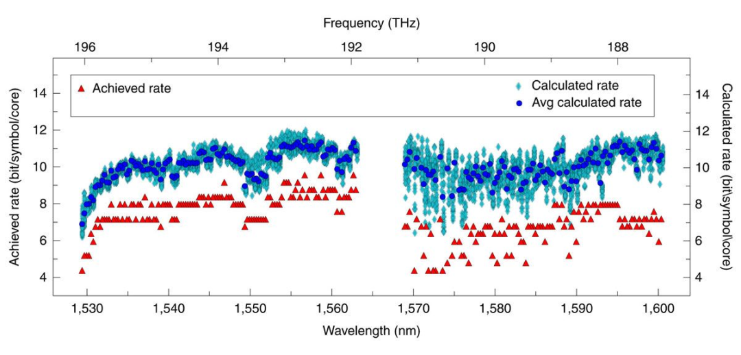 在实验中,研究人员仅使用一个光源在 7.9 公里的距离上实现了传输速率 1.8 Pbit/s——1 Petabit 相当于 12.5 万 Gigabyte,根据一些估算,全世界使用的平均互联网带宽约为 1 Pbit/s,因此它的速度接近全球带宽的两倍。