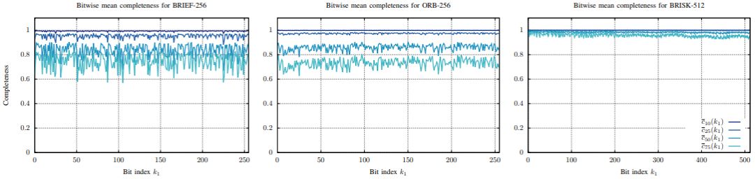 图3 在深度为1,匹配阈值为10,25,50,75的不同描述子类型的按位平均完整度。