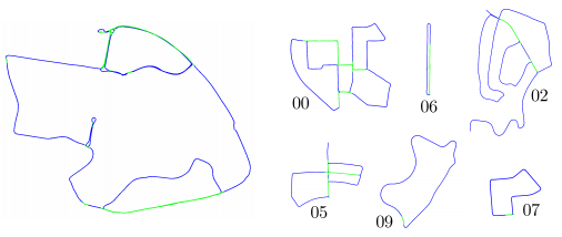 图4 从KITTI数据集中选取的用于后面算法比较的序列,其中蓝色是相机轨迹真值,高亮的绿色是匹配图像片段。