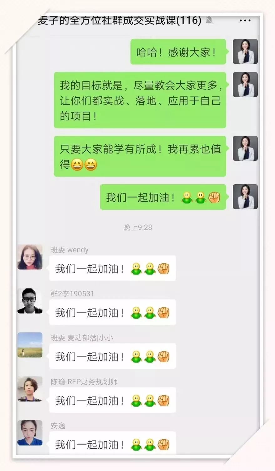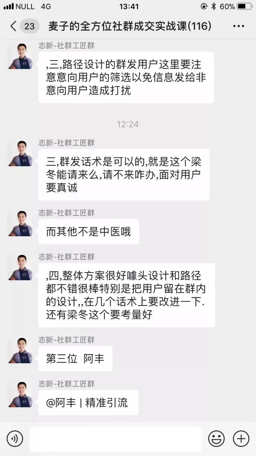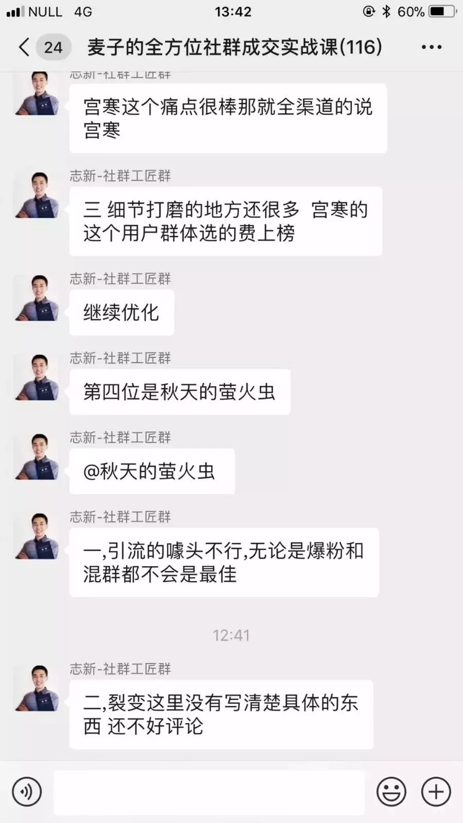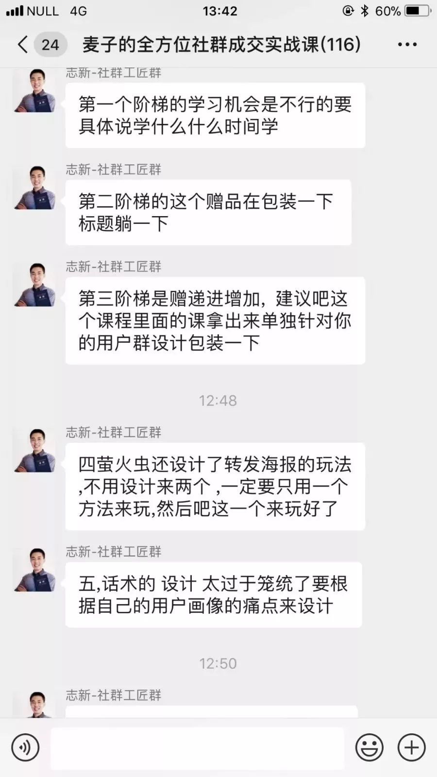 就这样,短短的15天,实战内容已经涵盖了用户画像分析、人群定位、噱头设计、裂变策划、群运营管理、促销策划、活动引爆、引流与裂变设计、群发售设计、朋友圈发售计划、返场补销等一系列社群必备大环节!
