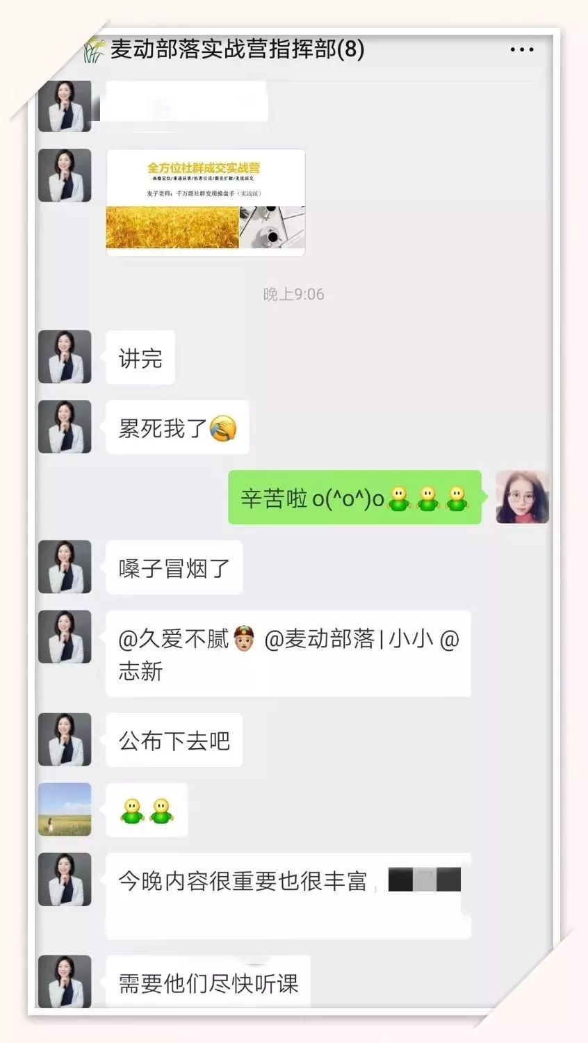 麦子这次的实战营更是如此;麦子和辅导员全程手把手辅导、教练式陪同,整整二十三四天的时间!她本人比学员更上心,更在意大家的收获与最终的成功。
