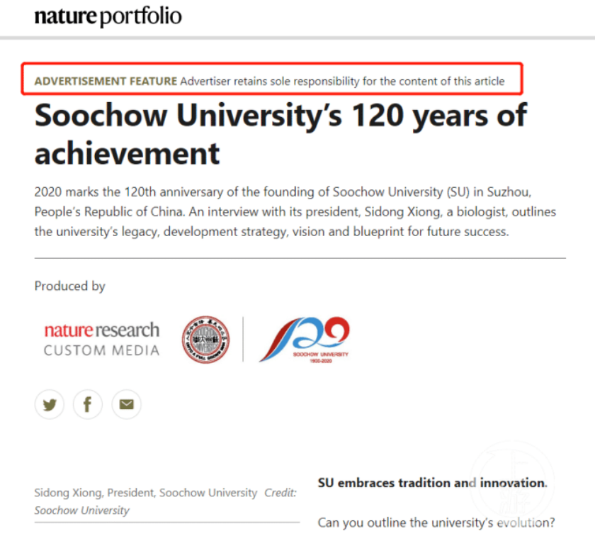 上游新闻记者又在网上检索到,也有其他高校在校庆发Nature特刊。上游新闻记者看到一名自称江苏某高校毕业的网友,于2020年4月16日在知乎发帖称:“今天被X大刷屏了,因为《Nature》期刊在今日发布了苏州大学120周年校庆特刊,点进去文章看,发现还有这样的字样:Advertiser retains sole responsibility for the content of this article,意思是广告客户对本文承担全部责任,这也就是说明是广告客户弄的。顿时有点心灰意冷,这广告的确就是拿钱办事的……”