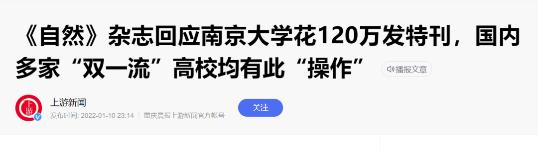 随后发文《《自然》杂志回应南京大学花120万发特刊,国内多家“双一流”高校均有此“操作”》。
