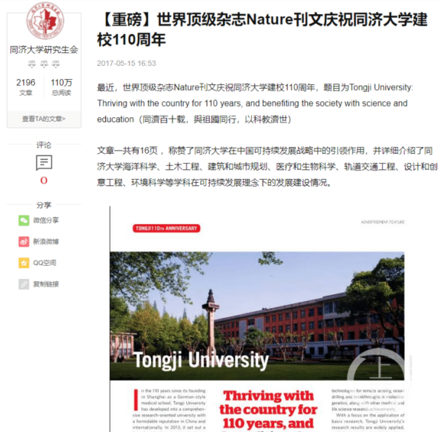 上游新闻记者在网上搜索到搜狐号ID为“同济大学研究生会”在2017年5月15日刊发的文章,标题为“[重磅]世界顶级杂志Nature刊文庆祝同济大学建校110周年”,文章称,最近,世界顶级杂志Nature刊文庆祝同济大学建校110周年,题目为Tongji University: Thriving with the country for 110 years, and benefiting the society with science and education