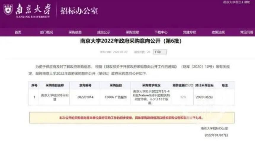 南京大学招标办公室此次公示的采购项目为“南京大学校庆特刊刊登”,采购品目为“C0806广告服务”。其采购需求概况称“南京大学拟于2022年3月-4月在Nature杂志刊登校庆特刊宣传稿,不少于12个版面”,预算金额为120万元,预计采购日期为2022年2月。消息一出,受到网友的热议,1月9日,校庆办公室工作人员向媒体回应称,花120万拟刊发校庆宣传稿,只是一个意向,且不会乱花钱。