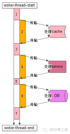 上图是一个典型的工作线程的处理过程,从开始处理start到结束处理end,该任务的处理共有7个步骤: