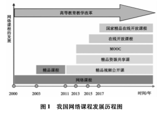 为深入推进2000年教育部启动实施的“新世纪高等教育教学改革工程”[1],充分发挥信息技术对教育教学变革的推动作用,教育部随即启动实施了“新世纪网络课程建设工程”[2],这是我国网络课程规模化建设与发展的起始性标志。随后,2003年教育部又发布了《教育部关于启动高等学校教学质量与教学改革工程精品课程建设工作的通知》(教高[2003]1号),在原网络课程建设的基础上开启了国家精品课程建设工程;2011年教育部又发布了《教育部关于国家精品开放课程建设的实施意见》(教高[2011]8号),开启了国家精品开放课程的建设,包括精品视频公开课与精品资源共享课,其中精品资源共享课是以原国家精品课程为基础,对其进行结构优化、转型升级;2015年教育部发布了《教育部关于加强高等学校在线开放课程建设应用与管理的意见》(教高[2015]3号),2017年教育部发布了《教育部办公厅关于开展2017年国家精品在线开放课程认定工作的通知》(教高厅函〔2017〕40号),这两个文件将以MOOC为代表的在线开放课程的发展推向了新的高度。本文通过对上述相关政策文件的梳理与分析,绘制了我国网络课程发展历程图,如图1所示。