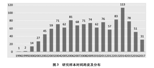 从刊载时间来看,研究样本刊载的时间跨度为1996年至2017年,其中1996至1999年为我国网络课程研究的萌芽阶段。自2000年起,我国学术界才逐渐开始关注网络课程并进行深入研究,这与我国网络课程规模化发展的时间基本一致。