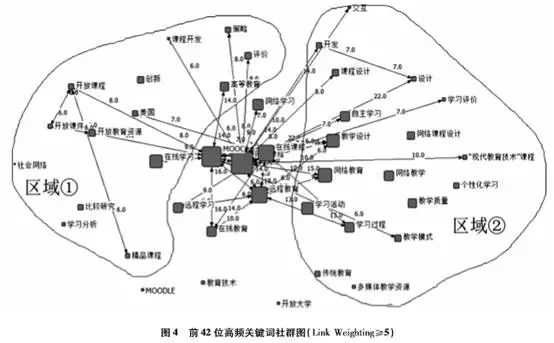 在高频关键词社群图中,每一个节点表示一个关键词,节点在图中的位置越靠近核心表示该节点在社群图中的中心度越高,节点与节点之间的连线权重值表示两关键词之间的共现频次(为更明显地呈现研究热点关键词之间的关联,本研究将社群图中LinkWeighting阈值设定为5)。从图4可明显看出:“MOOC”“网络课程”“在线课程”位于图谱最核心层次,“在线学习”“在线教育”“网络学习”“网络教育”“远程教育”“远程学习”位于图谱次核心层次,这在一定程度上表明课程是我国在线教育或网络教育研究的核心主题;从关键词在图谱左右侧分布来看,“学习活动”“自主学习”“学习过程”“个性化学习”“教学模式”“教学质量”“课程设计”“开发”等关键词在图谱右侧(区域②),与“远程教育”“网络教育”等关键词的关联度更强,这在一定程度上表明课程的设计与开发、课程教学质量评价、课程教学模式、学习者学习过程等是我国网络教育或远程教育的研究热点;“开放课程”“开放课件”“开放教育资源”“学习分析”“社会网络”“高等教育”“评价”“课程开发”等关键词在图谱左侧(区域①),与“在线学习”“MOOC”等关键词的关联度更强,这在一定程度上表明开放教育资源、MOOC与高等教育的融合是我国在线学习或MOOC的研究热点,学习分析技术为推进我国在线学习或MOOC的深度研究与实践提供了重要的技术支持。此外,通过区域①和区域②的比较分析,本研究发现,资源层面由关注多媒体教学资源到关注开放教育资源,在一定程度上反映了我国教育资源建设与应用理念的转变;相对于网络教育或远程教育的研究而言,课程教学质量、教学模式研究是我国在线学习或MOOC研究的薄弱点或未来的研究趋势;网络教育或远程教育的相关研究能够为深度开展在线学习或MOOC相关研究提供重要的借鉴经验与支撑成果。