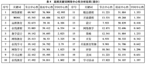 为更加准确、科学地从高频关键词中分析出我国网络课程的研究趋势,通过对多种方法进行比较分析后,最终选择了网络中心性分析技术。中心性的节点中心性、中间中心性、接近中心性能很好地反映社会网络中的结点和网络的整体特征,不但可以发现某一领域的研究热点,还可以识别未来的发展趋势。在某个研究领域中,节点中心性较高的度通常代表着当前的研究热点,节点中心性和接近中心性两项指标较低,而中间中心性较高的节点代表着新的发展趋势[13]。因此,本研究先通过BICOMB2软件将阈值在[3,384]范围内的关键词生成共现矩阵,然后将该矩阵导入Ucinet6软件进行网络中心性分析,分析结果如表4所示。