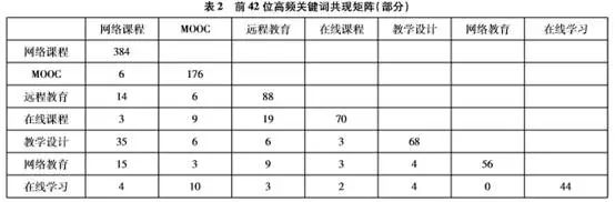 然而,将研究样本关键词按照频次由高到低排序后,第37—42个关键词的频次均为12,第40、41、42个关键词分别为“学习评价”“传统教育”“比较研究”,且与本研究主题密切相关。鉴于此,为增强研究的有效性,在g指数算法的基础上,根据研究需要将前42个关键词确定为高频关键词,如表1所示。最终确定的高频关键词词频累计为1562,占总词频的31.42%;包含高频关键词的文献共计915篇,占样本总量的81.12%。这意味着通过对前42位高频关键词的相关分析能够在很大程度上反映我国网络课程的研究热点。