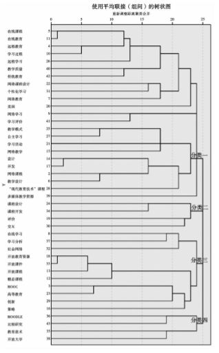 对高频关键词的聚类分析能够进一步反映高频关键词之间的亲疏关系,有利于深入分析我国网络课程的研究热点。关键词聚类分析的原理是以“共词”为分析对象,利用聚类的统计学方法,把关联密切的关键词聚集在一起形成类团。关键词聚类分析时,先以最有影响的关键词生成聚类,再以聚类中的种子关键词及相邻的关键词再组成一个新的聚类。关键词越相似它们的距离越近,反之,则较远[7]。