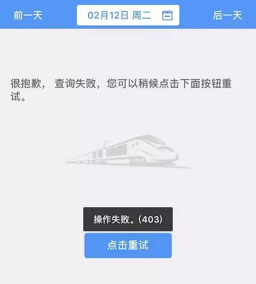 12306在使用时数次显示“操作失败”,无法显示列车列表;飞猪检索时未出错,预约购票后在第二天早上完成出票。