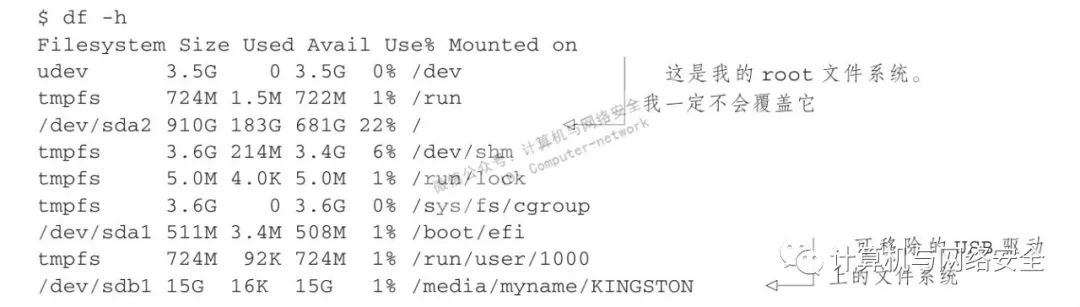 在这个例子中,在Kingston USB设备上安装了一个名为/dev/sdb1的文件系统。设备本身被称为/dev/sdb。