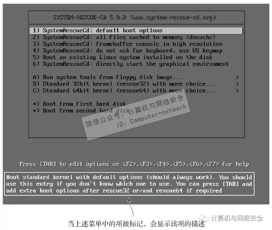 图13 SystemRescue启动时显示的Boot Options菜单。注意页面底部每个选项的详细解释