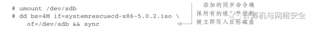 首先卸载驱动器,使dd可以完全访问。然后编写归档文件。在这个例子中,使用了systemrescuecd-x86-5.0.2.iso映像,并将其写入位于/dev/sdb的驱动器。