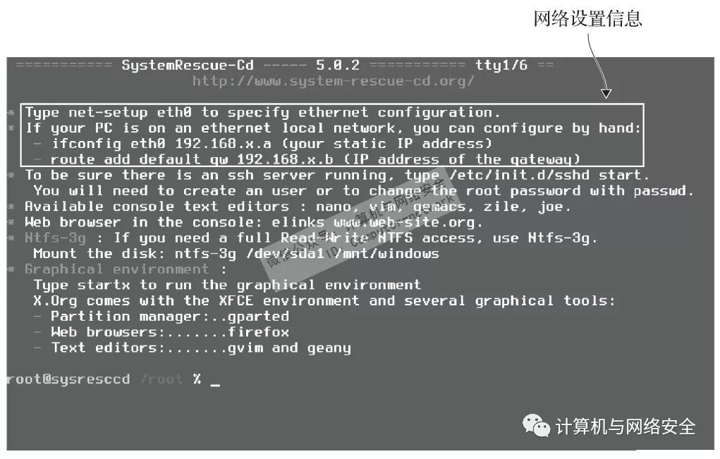 如果需要访问网络来下载或安装更多的工具,或者传输数据,可以在命令提示符处键入net-setup,选择正确的接口,并表明网络是有线的还是无线的。如果是无线网络,需要输入WiFi路由器的SSID和加密密钥(它可能使用ASCII而不是十六进制字符)。在大多数情况下,希望DHCP能自动检测网络。