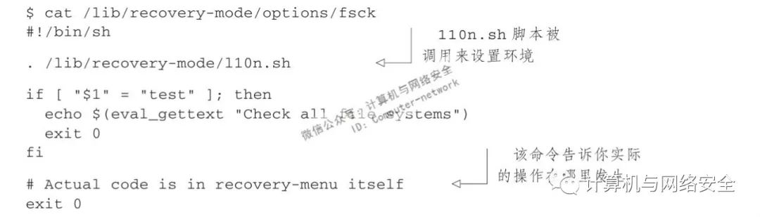 如果在/lib/recovery-mode/目录下寻找,将看到recovery-menu文件是显示如图3所示的菜单界面的脚本。option/目录包含执行每个菜单项的文件。例如,如果可能的话,fsck将会检查并修复任何损坏的系统文件。