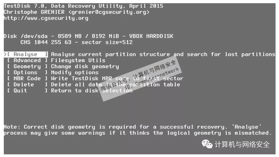 然后会发现自己面对一个如图15中显示的屏幕,可以要求TestDisk分析磁盘,寻找现有的分区。当发现并适当地标记了损坏的分区时,可以将更改写入磁盘,并且应该能够再次成功启动。
