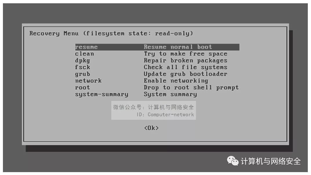 图4 Ubuntu Recovery菜单及带有基本诊断和修复工具的链接,以及打开shell会话作为root的选项