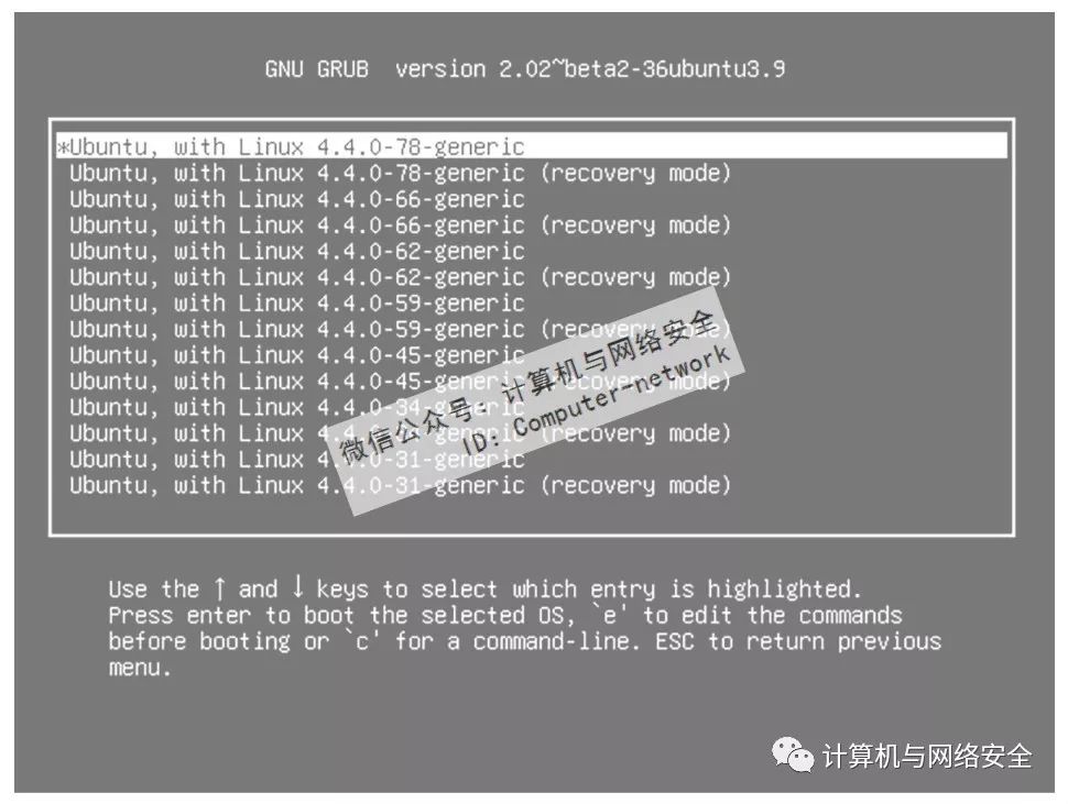 图2 Ubuntu下安装GRUB Advanced Options菜单显示最新的和旧的内核版本链接,以及在恢复模式下的启动选项