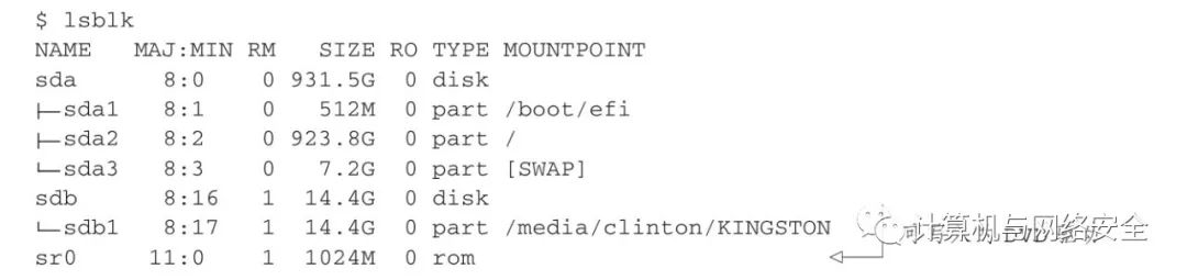 如果打算将映像写入光驱,比如CD或DVD,那么可以通过lsblk获得它的名称,lsblk表示list block devices。驱动器本身必须是可写的。这里DVD驱动器叫作sr0: