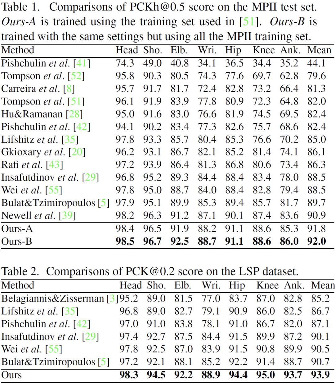 本文在 MPII 和 LSP、LSPEt 数据集上进行训练,使用 PCK (Percentage of Correct Keypoints) 和 PCKh 进行评估,PCK 计算估计的关键点与真实值间的归一化距离小于设定阈值的比例,PCKh 则以头部长度为参考的归一化。实验结果如下,可以看到使用 PRM-B 的 PyraNet 在所有对比的方法中都取得了最好的准确率。