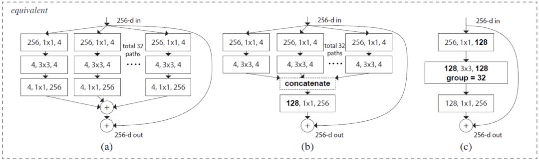 而在减少参数数量方面,ResNeXt 又在 ResNet 更进一步 [4],将初始的输入分裂成多条分支进行卷积,其中每条分支的卷积核大小都是一样的。