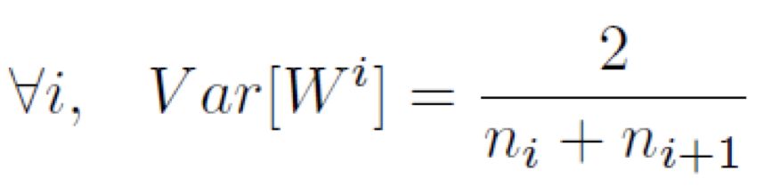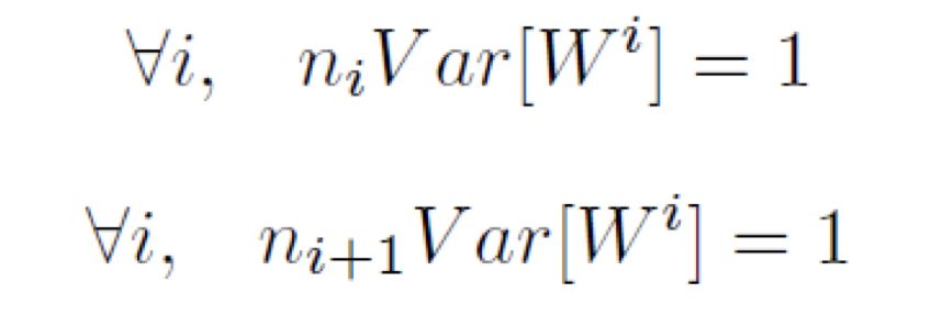 Xavier 的提出者指出,第 i 层的参数方差从正向和反向传播的角度考虑,应分别满足如下式子。其中的 n_i 和 n_(i+1) 分别是该层输入的元素个数以及输出的元素个数。