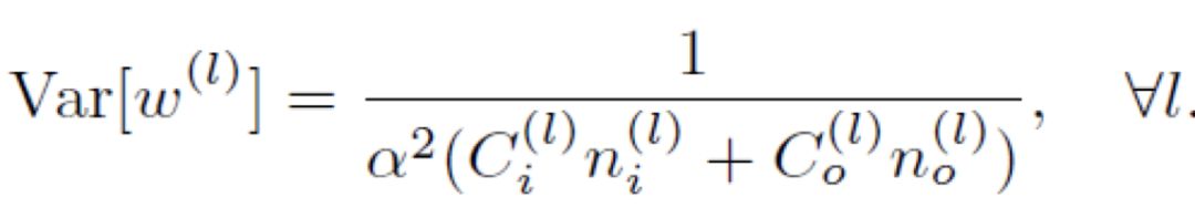 本文作者考虑到提出 Xavier 时的大部分网络并没有多条分支,因此对多分支网络的初始化方案重新考量,得出了如下的更泛化的结果。其中 l 表示网络层数,C_i 和 C_o 分别表示输入和输出分支数,n_i 和 n_o 分别表示各输入和输出分支的元素个数,α 根据激活函数有不同取值,ReLu 取 0.5。即从前向和反向传播的角度考虑,各层参数初始化时的方差应与各输入分支合并前的总元素个数、各输出分支分离后的总元素个数有关。