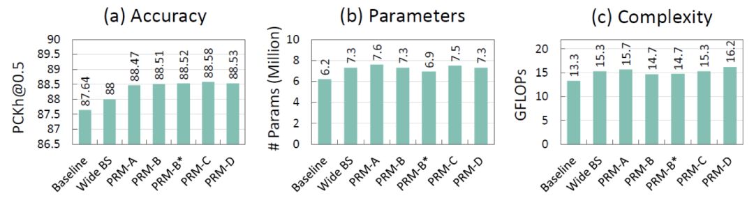 根据后面的实验结果可以看到在准确率、参数数量和复杂度的权衡之下,PRM-B 模块是较好的选择。