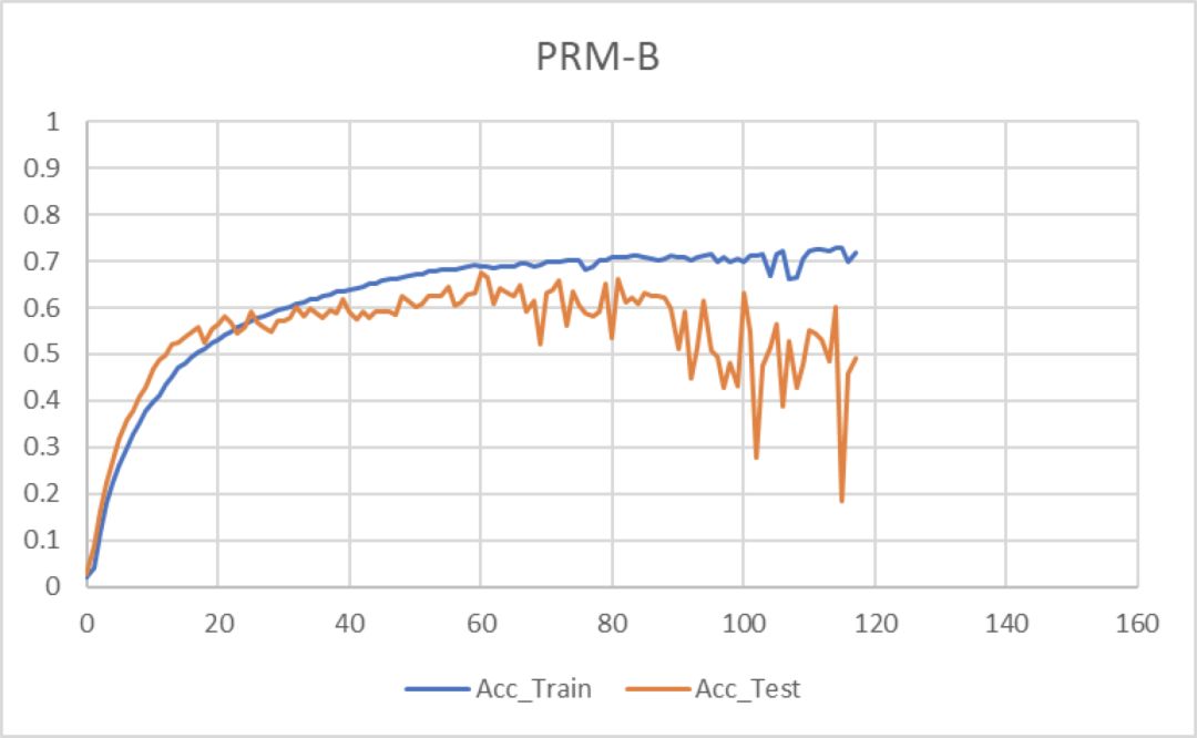 准确率曲线如下:使用 PRM-B 由于发生了过拟合,在 Epoch=110 处进行了早停,而使用 Res 则在 Epoch=110 时接近收敛。