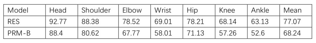 6. 实验结果:本次复现结果使用 PRM-B 模块的 PyraNet 并没有比使用 Res 模块的堆叠沙漏网络效果要好。准确率使用 PCKh@0.5 进行评估。