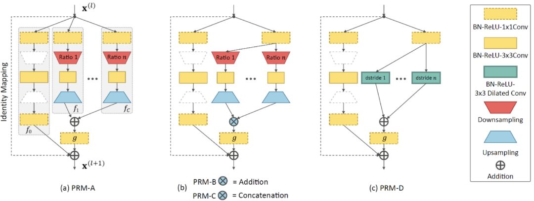 PRM-C 则是将 PRM-B 中多分辨率特征的相加改为了串联,由于串联后的特征通道数与原来不同,因此可能需要再进行一个 1*1 的卷积对齐特征通道后再与原特征相加。