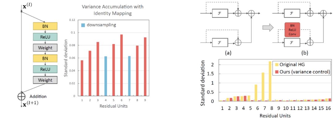除了上述的改进,本文作者还提到原始的残差模块有输出方差积累的问题,当堆叠多个残差块时,将原始特征直接与卷积后的特征相加时会有较大的方差,通过对原始特征添加一个 Bn-ReLu-Conv 操作可以较好的控制这个问题。