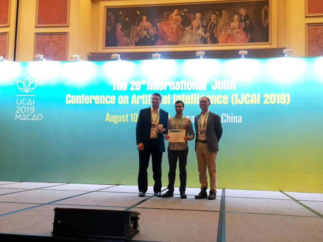 Noam 在 IJCAI 2019 大会上领取马文 · 明斯基奖章证书。