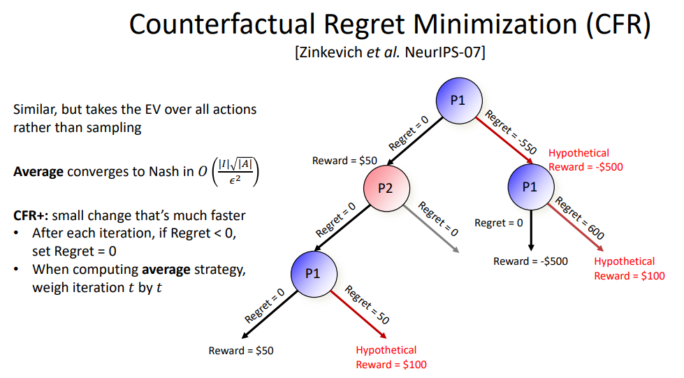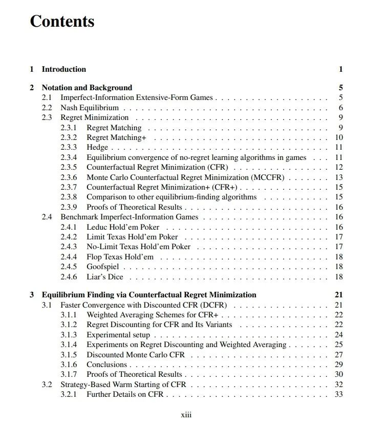 作者首先介绍了对反事实遗憾最小化(counterfactual regret minimization, CFR)做出的改进,这是一种在双人零和博弈中收敛至纳什均衡的迭代算法。此外还描述了 CFR 的新变体,它们利用折扣原则(discounting)来显著加快收敛速度。