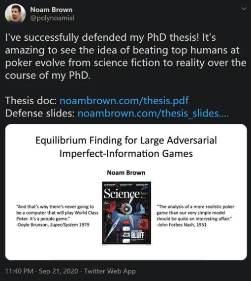 当地时间 9 月 21 日,FAIR 研究科学家 Noam Brown 在推特宣布其顺利完成了 CMU 博士论文答辩,并公开了长达 230 页的超硬核博士论文《Equilibrium Finding for Large Adversarial Imperfect-Information Games》以及 101 页的 slides。