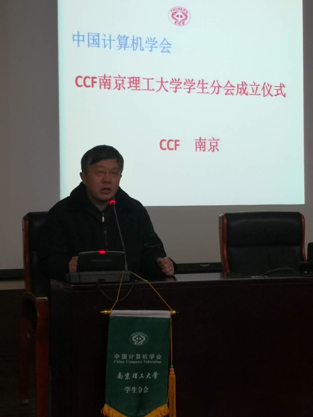 出席本次成立大会的嘉宾有CCF南京主席、南京航空航天大学计算机学院院长陈兵教授,CCF杰出会员、南京执委、南京理工大学计算机学院副院长张功萱教授,CCF南京副主席、南京理工大学计算机学院院长助理肖亮教授, CCF南京副主席孙国梓教授,CCF 南京秘书长、南京航空航天大学计算机学院副院长孙涵,CCF 南京副秘书长吉旭,CCF 南京执委、河海大学计算机学院副院长毛莺池教授等。参加本次成立大会的还有CCF南京理工大学学生会员,以及来自计算机和其他学院的学生代表们。成立仪式由肖亮教授主持。