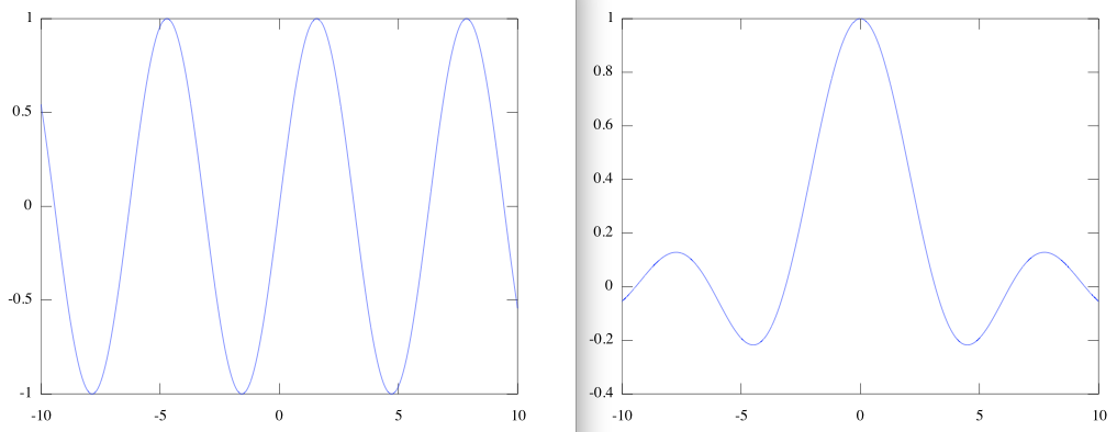 下图的左边是sin函数的图像,右边是sinc函数的图像,可以看到明显的水波纹特征。