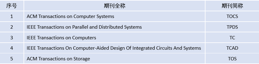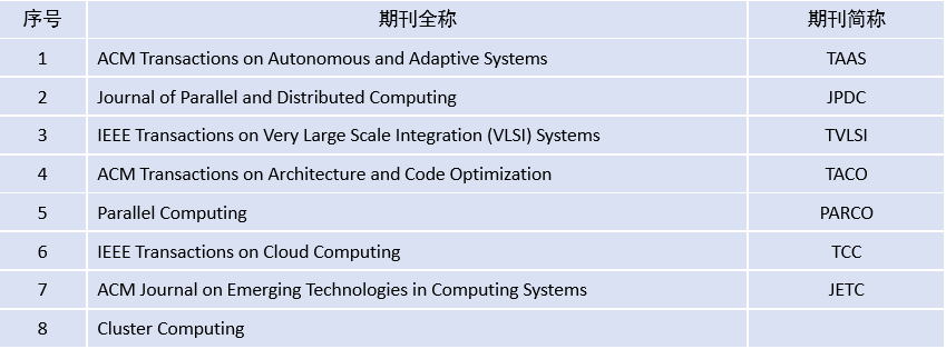 在高性能计算方向,清华与CCF推荐的A类期刊相同,都有5个,排序略有不同;清华推荐期刊列表中有8个B类;CCF有10个B类、11个C类。
