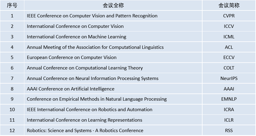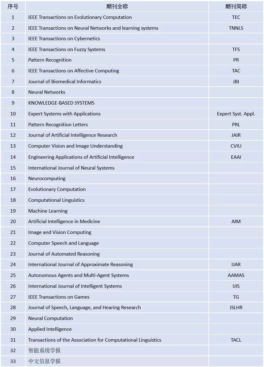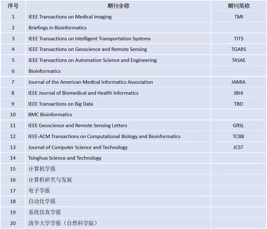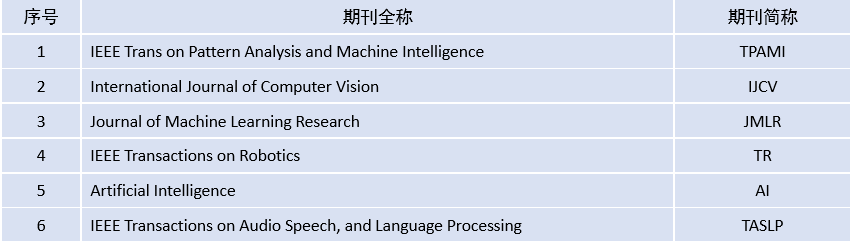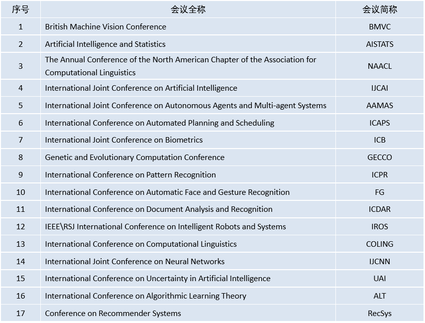 在人工智能与模式识别方向,清华推荐了12个A类会议,17个B类会议;A类期刊6个,B类期刊33个。