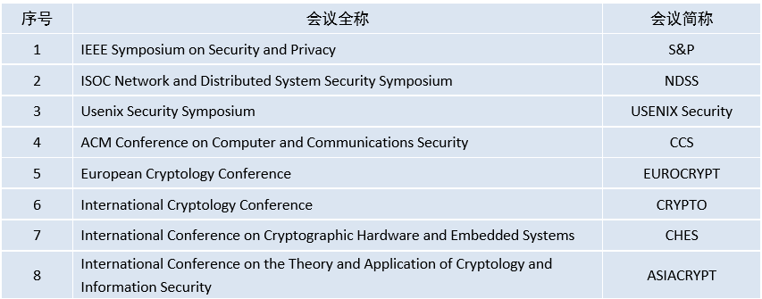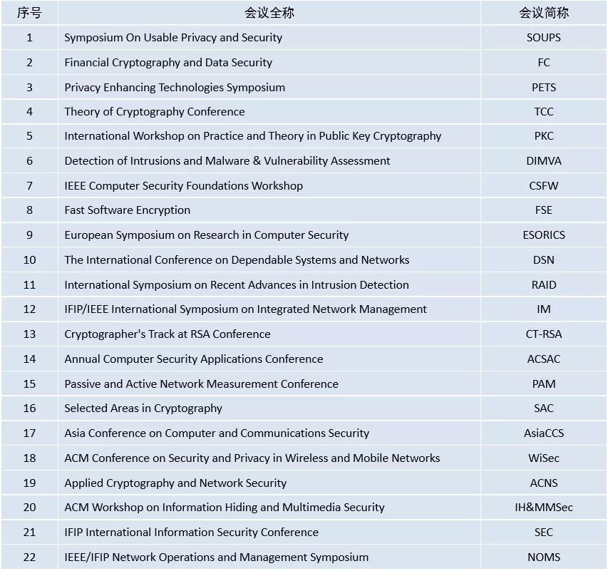 在网络与信息安全研究方向,清华推荐的A类会议8个,B类会议22个。A类期刊3个,B类期刊4个。