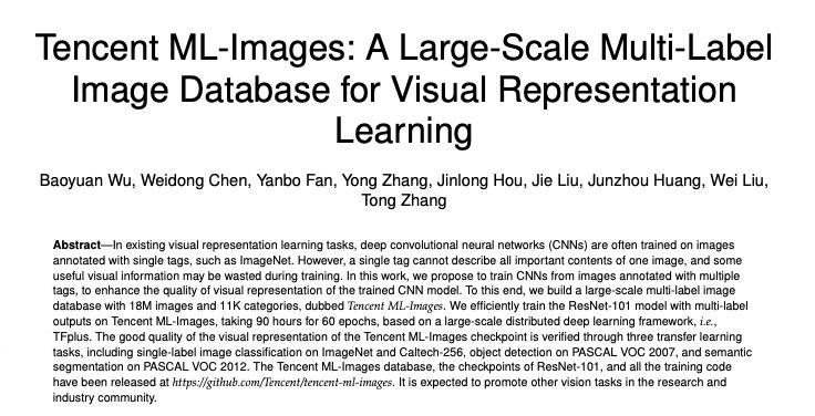 Tencent ML- Images 是最大的开源多标签图像数据集,包括 17,609,752 个训练和 88,739 个验证图像 URL,最多可注释 11,166 个类别。