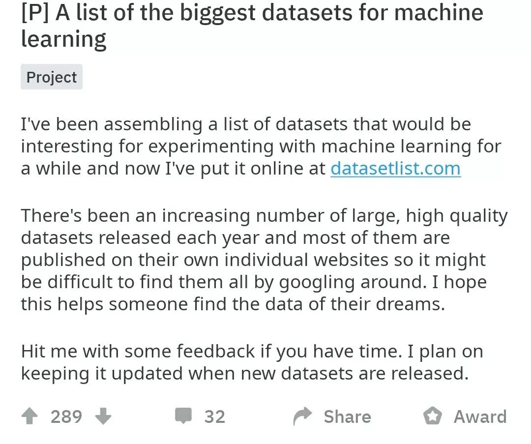 这套数据集搜索列表的出现,也满足了不少强迫症患者对于选择 / 整理数据集的想法。不过,也正如这位网友所言:这个数据集列表的形式将有待完善和丰富,设计这个网页的目的也是希望接下来不断更新新的数据集,同时,用户也可以通过邮箱、Twitter、Facebook 等方式订阅以获取最新内容。