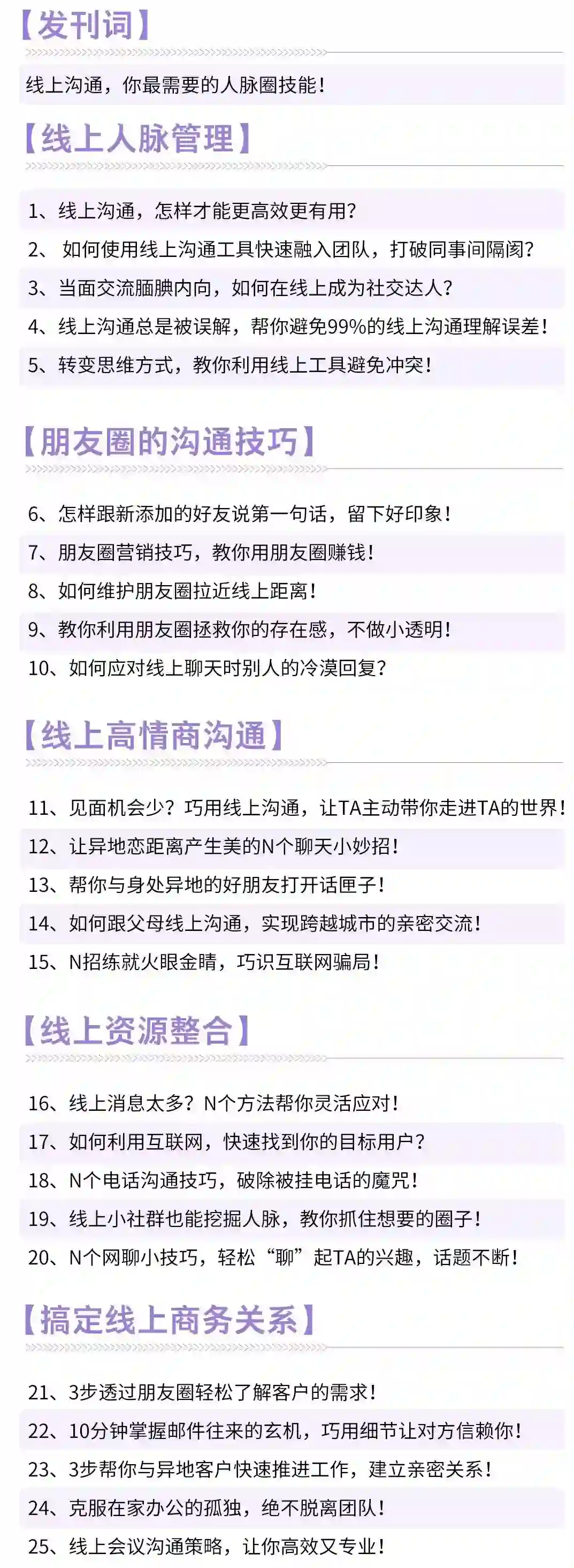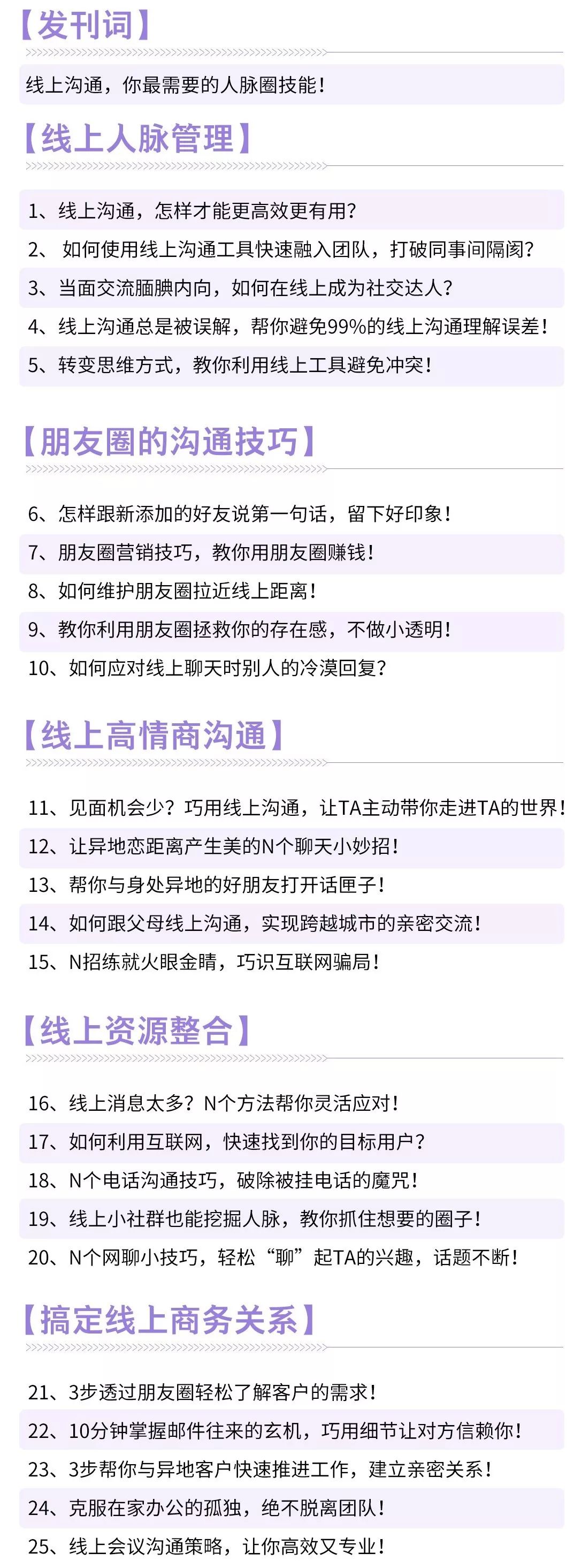 从线上人脉管理、朋友圈的沟通技巧、搞定线上商务关系等五大模块