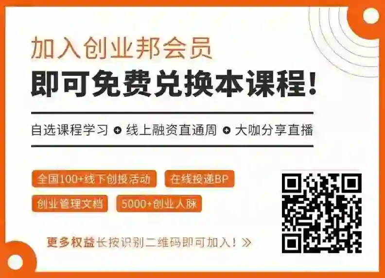 现在加入创业邦会员,只要1098!本套课程免费送!5000+创业人脉、行业、地区各个社群资源对接;创业文档大礼包;免费参加创业邦全年3次峰会及无限次参加全国12座城市线下所有活动!扫码即可加入!