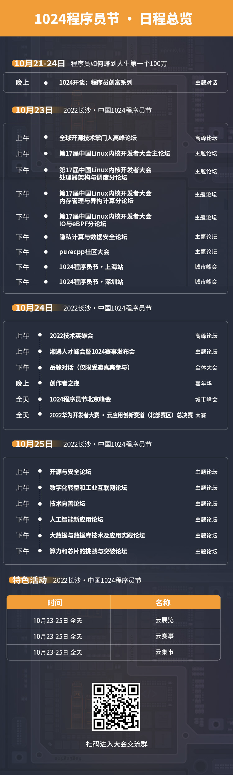 全球开源技术掌门人高峰论坛、第 17 届中国 Linux 内核开发者大会、隐私计算与数据安全论坛、purecpp 社区大会,以及上海站、深圳站城市嘉年华同步开启,海内外开源掌门人、技术专家、领域精英,以及各界技术人才齐聚。还有云上演播厅、云展览、云大赛、云市集,不止线下赴会,“云”上精彩再续。